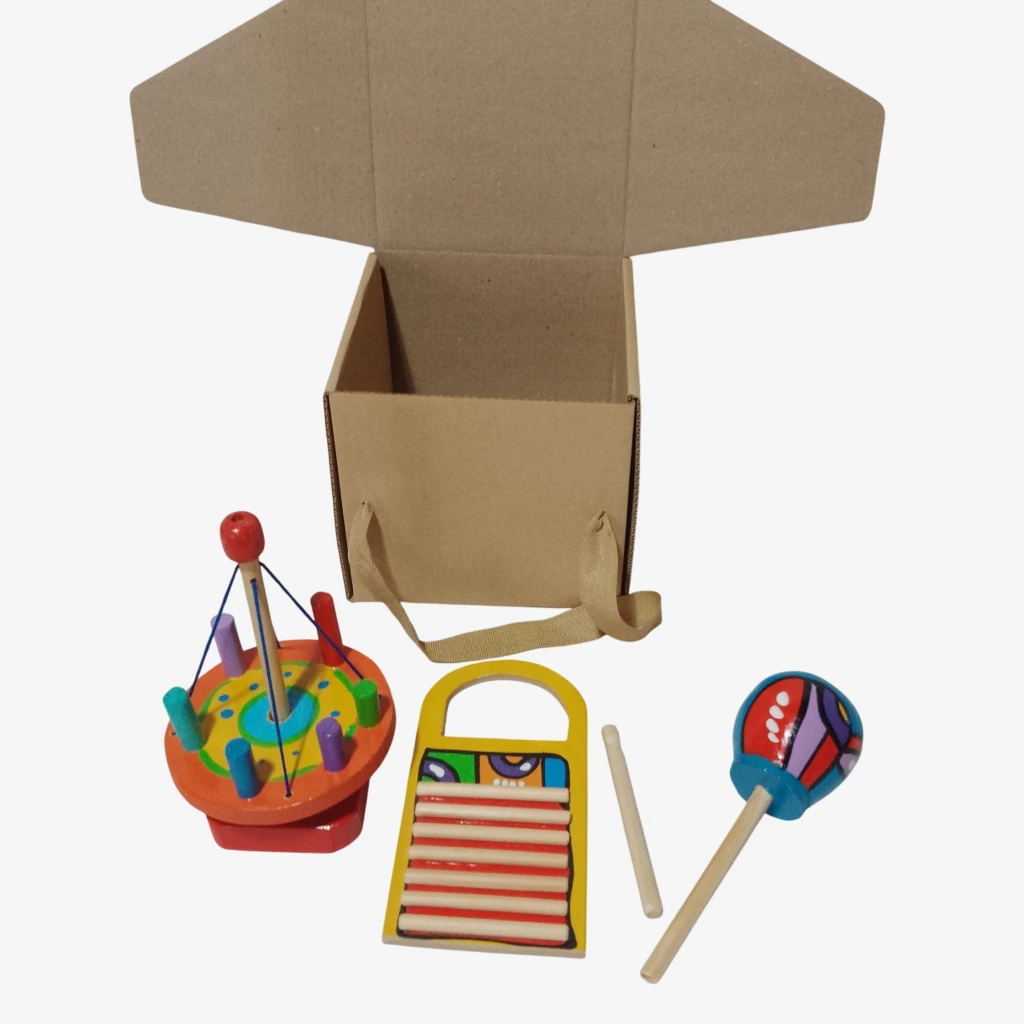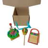 Descubrí nuestro combo didáctico musical que incluye una mini calesita para estimulación visual, una maraca y un güiro raspador, todo presentado en una práctica cajita ideal para regalar.